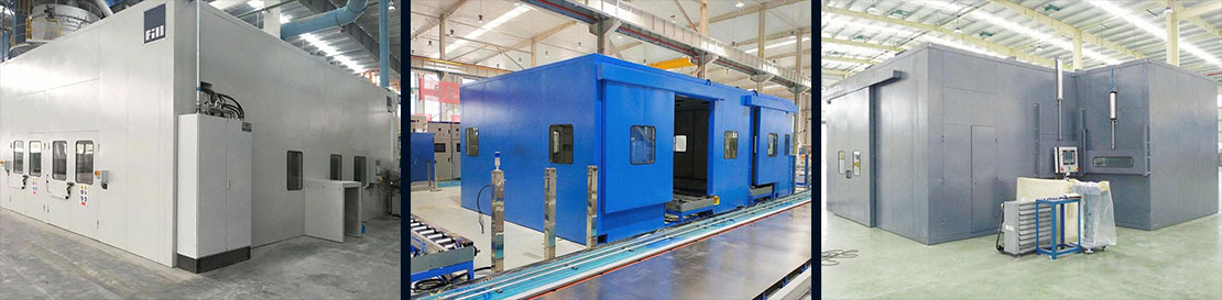 Easy assembly/disassembly, durability of up to 10 years, excellent sound insulation, efficient ventilation system, and pneumatic doors for workpiece access.