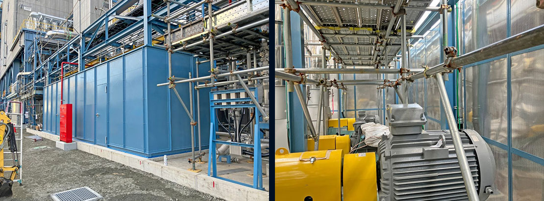 We installed a U-shaped sound barrier for a chemical raw materials production facility to mitigate noise generated by multiple industrial fans. While referred to as a “soundproof wall,” its configuration — enclosing the fans from three sides with an open ceiling — functions more like a partial acoustic enclosure.